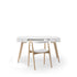 Med dette settet følger det Wood armstol, som er designet som et opplagt supplement til Wood-skrivebord, og kan justeres i to høyder så det kan tilpasses barnets utvikling. Stolens runde ryggstøtte og delikate samlinger skaper en visuell letthet og ubesvært uttrykk i innredningen, mens detaljer som rammens lett skå ben er uttrykk for den høye håndverksmessige kvalitet.