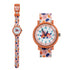 Fin barneklokke fra Djeco med minutt-tall som gjør det lettere å lære klokken. Det fine designet gjør det attraktivt for barn å gå med klokke. Klokka er støtsikker og har japansk Miyota 2035 urverk og Sony SR626SW batteri. Lengde på klokkereimen er 20 cm, bredde på klokkereimen er 1,4 cm og selve klokken er Ø: 3 cm.