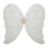 Englevinger i fjærlignende, hvit tyll med en stor glitrende gullstjerne i midten. Vingene har elastiske skulderstropper og en vakker engleform – perfekt for julens leker og utkledning.