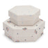 Flott sekskantet oppbevaringseske fra Konge Sløjd, med vakre tekstiler som matcher velkjente trykk. Esken kommer i et sett med 2 stk. i to forskjellige mønstre, og egner seg for oppbevaring av favorittleker, smykker, hårspenner m.m.