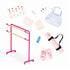 Å bli en dyktig ballettdanser krever hard trening. I dette tilbehørssettet får du alt du trenger til treningen. Settet inneholder blant annet en barre, yogamatte, ballettsko, sportsveske og vannflaske. Passer til Our Generation-dukker i str. 46 cm.