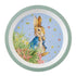 Peter Kanin-tallerken fra Petit Jour Paris med grønn kant og søtt motiv av Peter Kanin blant blomster og gress. Tallerkenen er laget i slitesterk melamin og har en flat form som er ideell for små barn som øver på å spise selv. Den lette vekten og høye kanten gjør det enkelt å få maten opp på skje eller gaffel. Perfekt for barn fra 6 måneder.