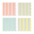Flotte servietter med pastellfargede striper. Perfekt til piknik, påske, hagefester og bursdager når du vil tilføre liv og farger. Finnes her i pakke med 16 stk. med bølget kant. Måler 16,5 x 16,5 cm.