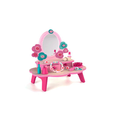 Søtt sminkebord i tre fra Djeco fylt med rosa farger og detaljer. Sminkebordet er i en praktisk størrelse som passer godt til jenterommet og er designet med speil og skuffer til oppbevaring av hårspenner, smykker og jentenips. Det følger forskjellige små ting med til å pynte seg med.