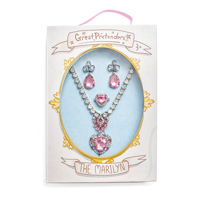 The Marilyn fra Great Pretenders er et fint smykkesett til lek og utkledning. Dette settet består av 2 øredobber, 1 fingerring, et halskjede. Leveres i boks med gjennomsiktig lokk, som gjør settet til en ideell gaveide. Fra 3 år.