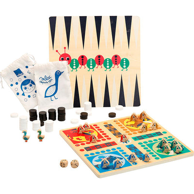 En vakker treeske med 4 klassiske spill fra Vilac. Esken er illustrert av Ingela P. Arrhenius og er enkel å pakke sammen og ta med seg på farten. En god samling klassiske spil, som inndbyr til mange timers lek. Inneholder: Dam, Ludo, backgammon og kortspill. Anbefalt fra 4 år.