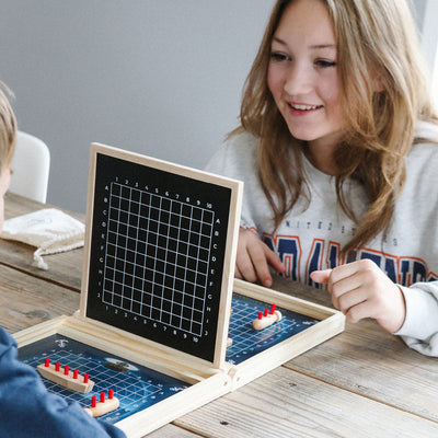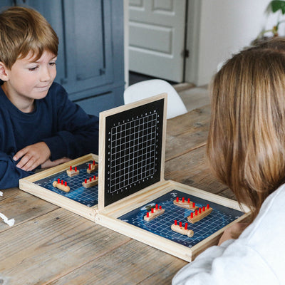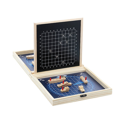 Opplev spennende sjøslag i dette senke slagskip for to spillere. Hver spiller har 5 skip, som skal senkes og små poletter angir, hvilke skip som er rammet. Medfølgende kritt anvendes til å notere i diagrammet, hvor mange skudd som er avfyrt.